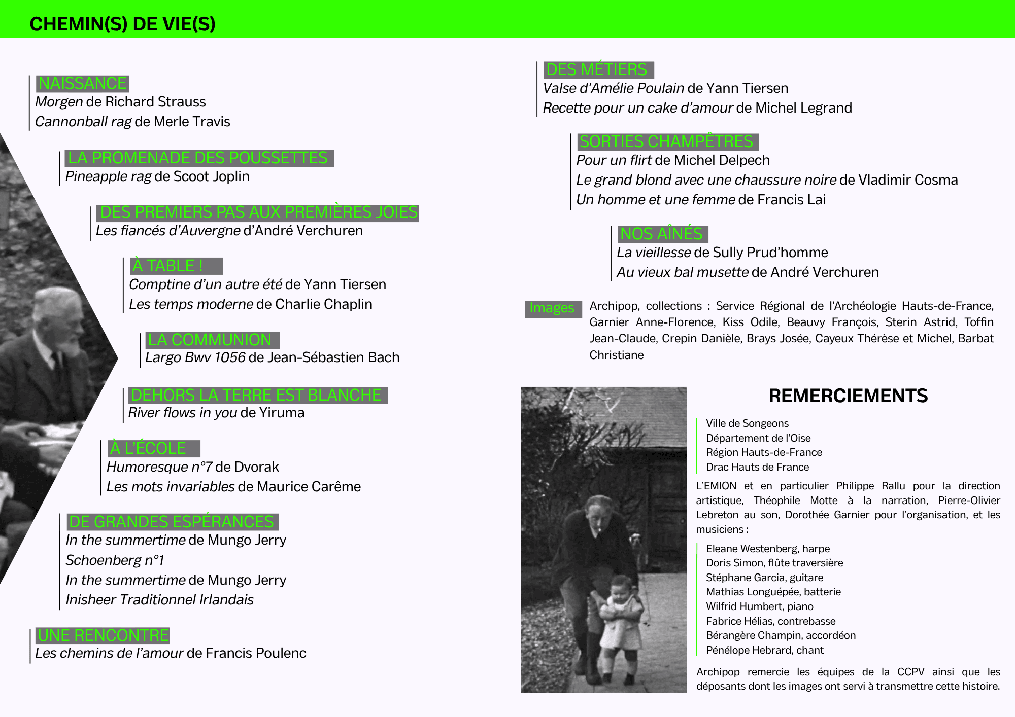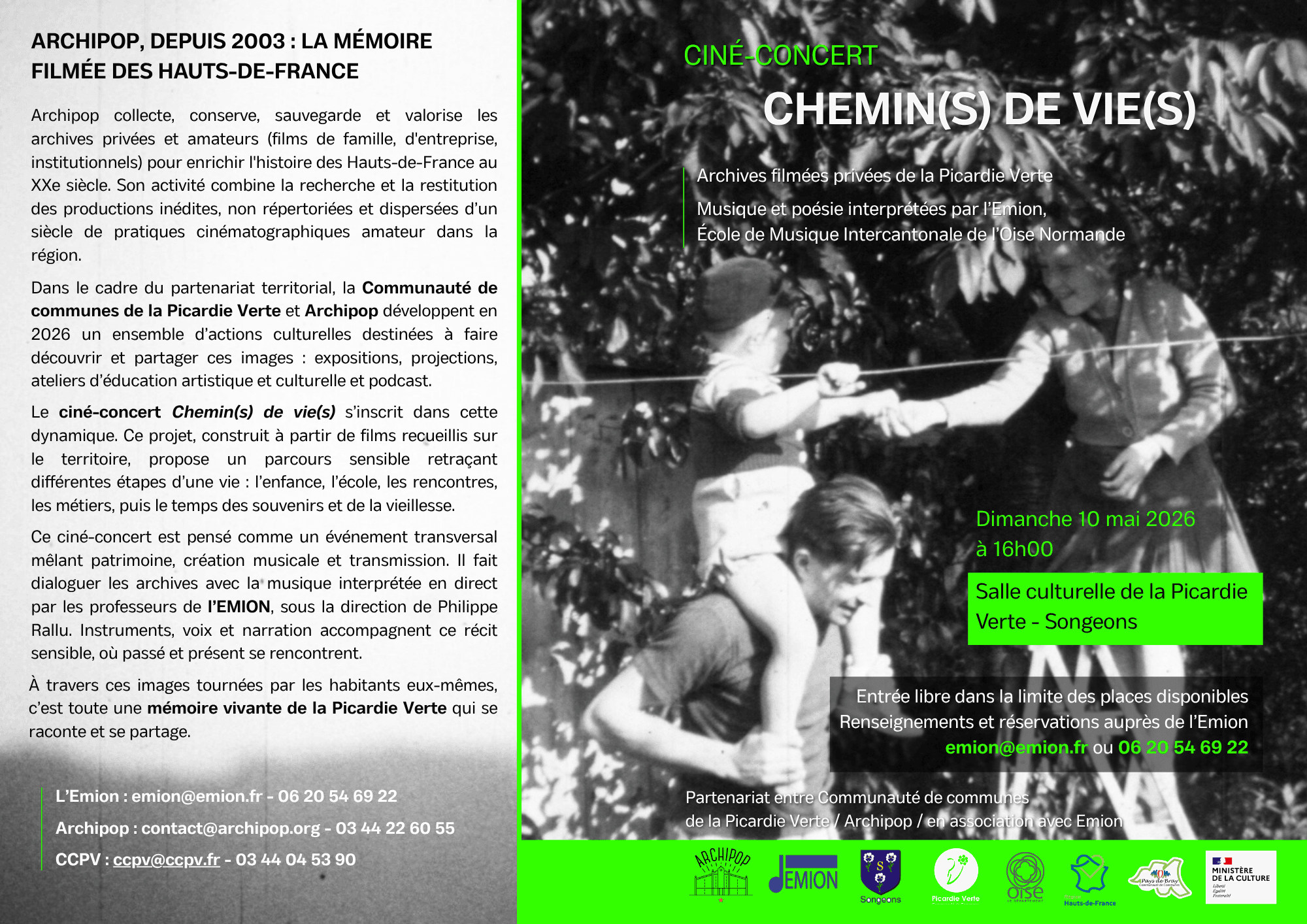 Le ciné-concert Chemin(s) de vie(s) s’inscrit dans cette dynamique. Ce projet, construit à partir de films recueillis sur le territoire, propose un parcours sensible retraçant différentes étapes d’une vie : l’enfance, l’école, les rencontres, les métiers, puis le temps des souvenirs et de la vieillesse.